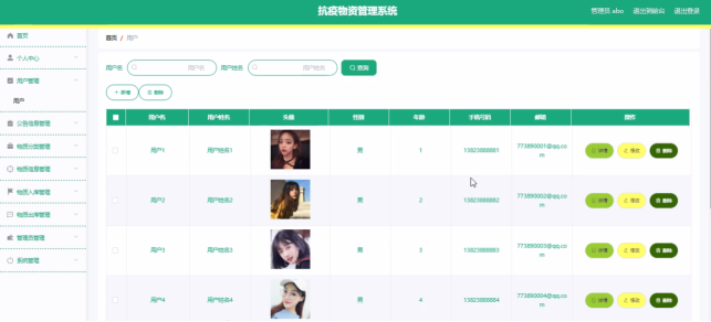 管理员对用户管理获取用户名、用户姓名、头像、性别、年龄、手机号码、邮箱等信息并进行详情、删除、修改。用户管理效果图如图5-2所示。
