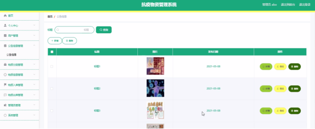 管理员对公告信息管理查看标题、图片、发布日期等信息进行详情、删除、修改操作。公告信息管理效果图如图5-3所示。