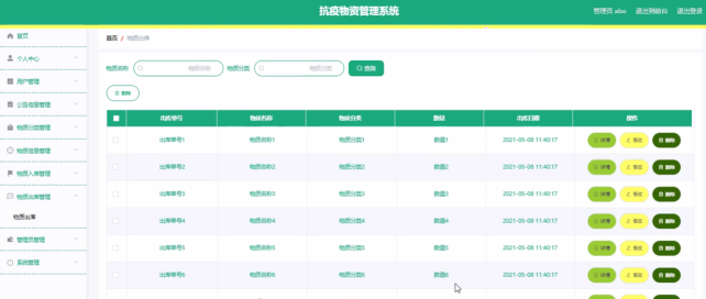 管理员对物质出库管理进行查看出库单号、物质名称、物质分类、数量、出库日期等信息进行详情、删除、修改操作。物质出库管理效果图如图5-8所示。