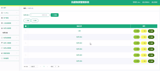 管理员对物质分类管理进行查看物质分类等信息进行详情、修改、删除操作。物质分类管理效果图如图5-5所示。