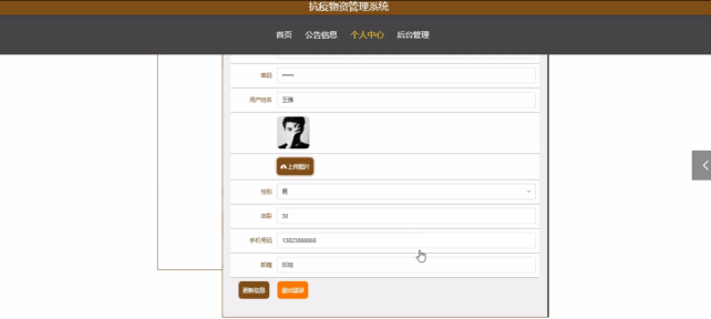 个人中心,在个人中心页面中可以填写用户名、密码、用户姓名、头像、性别、年龄、手机号码、邮箱等详细信息进行更新信息、退出登录,如图5-15所示。