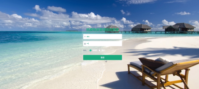 管理员登录,通过填写用户名、密码、角色等信息,输入完成后选择登录即可进入抗疫物资管理系统,如图5-1所示。