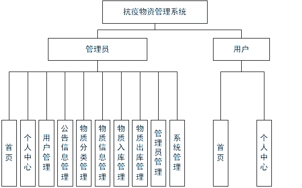 通过系统需求分析,本抗疫物资管理系统的功能结构设计如图4-1所示: