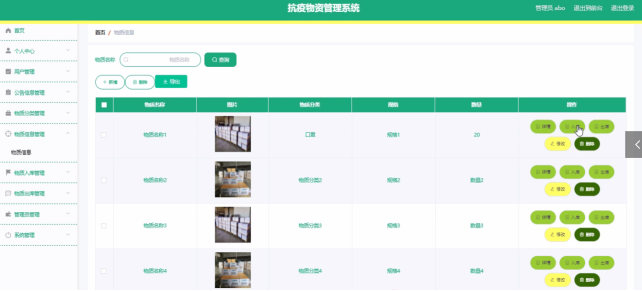 本课题要求实现一套抗疫物资管理系统的开发与实现,主要实现功能包括管理员:首页、个人中心、用户管理、公告信息管理、物质分类管理、物质信息管理、物质入库管理、物质出库管理、管理员管理、系统管理,用户;首页、个人中心。