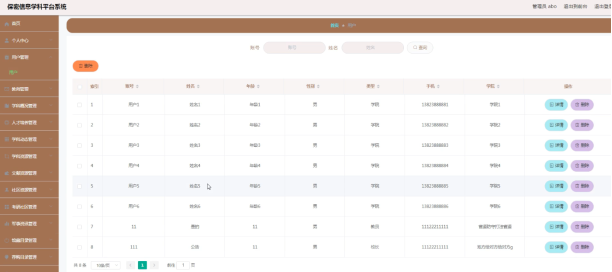 基于保密信息学科平台系统的系统管理员可以对用户信息查询。具体界面的展示如图5.1所示。
