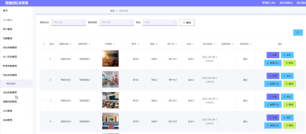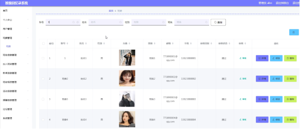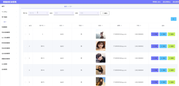 海滨学院班级回忆录的系统管理员可以管理用户,可以对用户信息修改删除以及查询操作。具体界面的展示如图5.1所示。