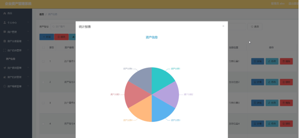 系统管理员可以查看对资产信息进行添加,修改,删除以及查询操作,还可以对资产信息进行统计。具体界面如图5.2所示。