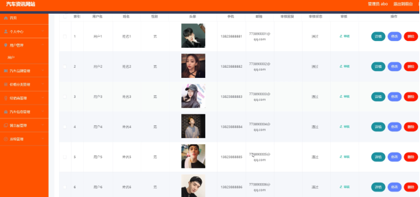 汽车资讯网站的系统管理员可以管理用户,可以对用户信息修改删除审核以及查询操作。具体界面的展示如图5.1所示。