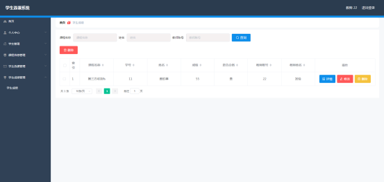教师进入指定功能操作区之后可以管理学生选课信息。其页面见下图。学生参与课程选课,教师负责审核,并在课程学习结束之后,为学生学习的课程进行打分。