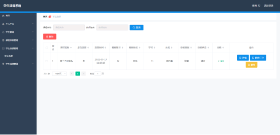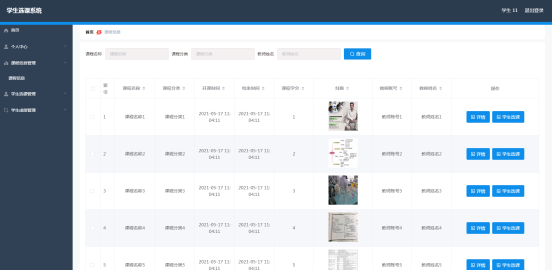 学生进入指定功能操作区之后可以管理课程信息。其页面见下图。学生查看课程的学分,开课时间与结束时间,课程名称等信息,学生点击课程信息右侧的学生选课按钮,可以选择该课程。