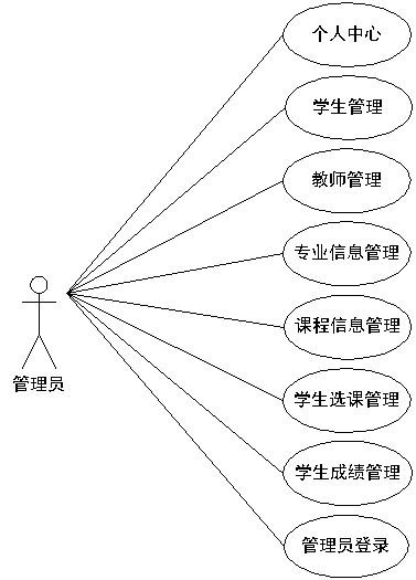 学生选课系统经过分析,确定了其需要设置管理员的角色,其操作的功能通过用例图展示(见下图)。管理员管理专业,教师,学生,课程,查看学生选课以及学生成绩信息。