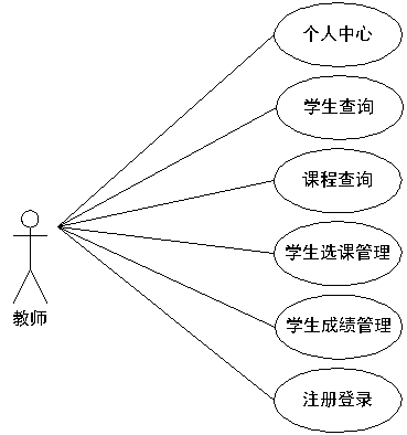 学生选课系统经过分析,确定了其需要设置教师的角色,其操作的功能通过用例图展示(见下图)。教师查询学生,查询课程,审核学生选课信息,为学生学习的课程进行成绩打分。