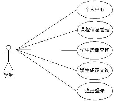学生选课系统经过分析,确定了其需要设置学生的角色,其操作的功能通过用例图展示(见下图)。学生参与课程选课,查询选课信息,查询已选课程的成绩信息。