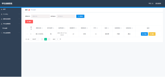 学生进入指定功能操作区之后可以查询学生选课信息。其页面见下图。学生提供教师姓名,或者是提供课程名称可以查询学生选择的课程信息,查询出来的选课信息可以显示学生已选的课程的审核情况。