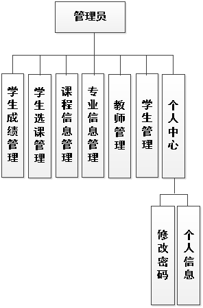 在前面分析的管理员功能的基础上,进行接下来的设计工作,最终展示设计的管理员结构图(见下图)。管理员管理专业,教师,学生,课程,查看学生选课以及学生成绩信息。