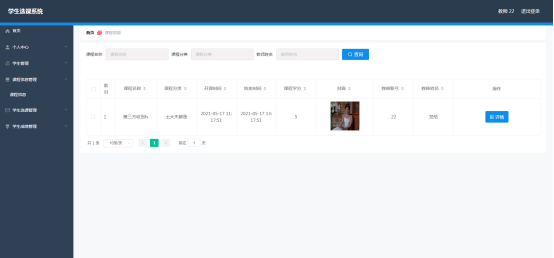 教师进入指定功能操作区之后可以查询课程。其页面见下图。课程信息是管理员负责增删改查,教师只需要查询课程,查看课程详情。