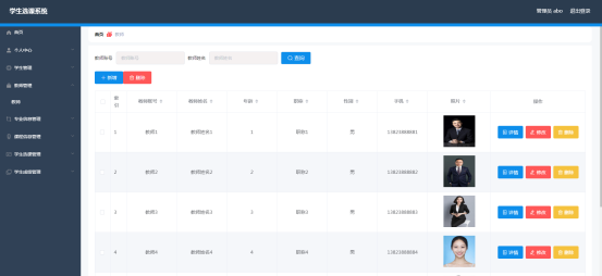 管理员进入指定功能操作区之后可以管理教师。其页面见下图。教师的资料需要管理员负责管理,包括修改,新增,删除等操作。