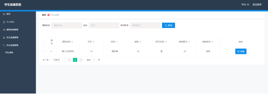 学生进入指定功能操作区之后可以查询学生成绩。其页面见下图。学生查询已选课程的成绩信息,查看成绩详情,包括分数,是否合格,教师姓名等信息。
