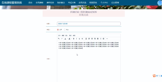 教师可以对在线课程信息进行添加,修改,删除操作,可以对在线课程发布课件,发布知识点,发布大纲。界面如下图所示: