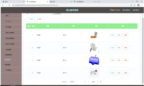 如图5.4显示的就是商品资讯管理页面,此页面提供给管理员的功能有:查看已发布的商品资讯数据,修改商品资讯,商品资讯作废,即可删除。