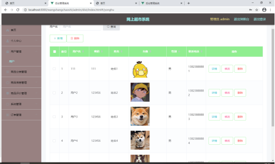 如图5.1显示的就是用户信息管理页面,此页面提供给管理员的功能有:用户信息的查询管理,可以删除用户信息、修改用户信息、新增用户信息,