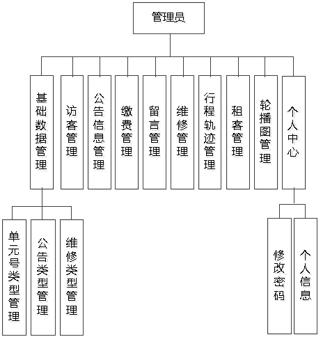 图4.1即为设计的管理员功能结构,管理员权限操作的功能包括对租客,访客,缴费,维修,留言,公告,租客的行程轨迹等进行管理。