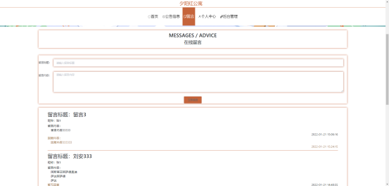 图5.7 即为编码实现的在线留言界面,租客在该界面中发布留言时,需要对留言的内容以及留言的标题进行编辑,然后提交。同时,租客可以查看本页面显示的所有留言以及管理员的回复信息。
