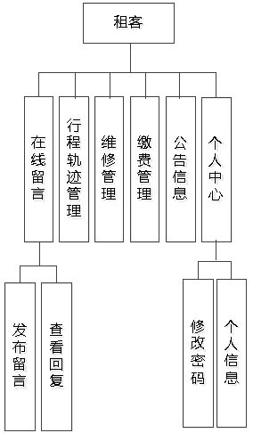 图4.2即为设计的租客功能结构,租客权限操作的功能包括管理行程轨迹,在线缴费,在线留言,申请报修,查看公告等功能。
