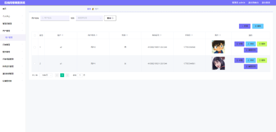 图5.4 即为编码实现的用户管理界面,管理员在该界面中为用户重置密码,修改用户基本信息,新增用户,删除需要删除的用户信息。