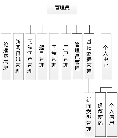 图4.1即为设计的管理员功能结构,管理员权限操作的功能包括对注册用户信息的管理,对问卷,题目,问卷调查,新闻资讯等信息的管理。
