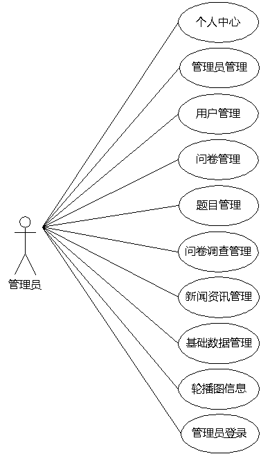 图3.5即为管理员用例图,管理员权限操作的功能包括对注册用户信息的管理,对问卷,题目,问卷调查,新闻资讯等信息的管理。
