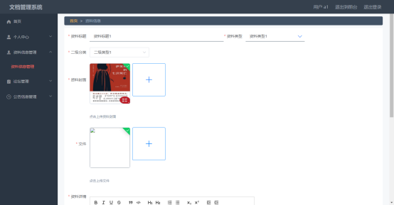 用户登录后可以在资料管理里面添加资料信息。