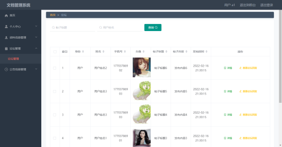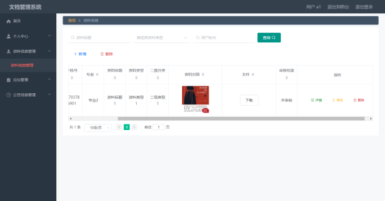 用户可以看到自己添加的资料信息,包含是否审核状态以及可以对自己添加的资料信息进行添加,修改,删除,查询操作。