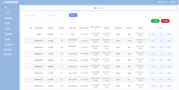 管理员可以对前台的招聘信息的基本信息进行管理,新增招聘信息,删除招聘信息,修改招聘信息。招聘信息管理界面如图5.2所示。