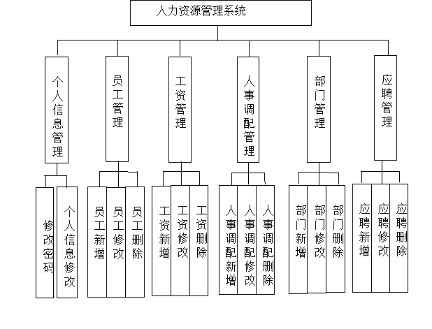 人力资源管理系统系统在进行系统中功能模块的划分时,采用层次图来进行表示。层次图具有树形结构,它能使用矩形框来描绘数据信息。顶层代表的数据结构很完整,顶层下面的矩形框表示的数据就是子集数据,当然处于最下面的矩形框就是不能再进行细分的数据元素了,使用层次方框图描述系统功能能让用户一目了然,能够明白系统的功能,以及对应功能板块下面的子功能都可以清楚领会。人力资源管理系统分为管理员和用户两部分操作角色,下面将对他们的功能进行阐述。