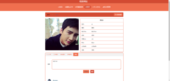 图5.7 即为编码实现的相亲信息界面,用户在相亲信息界面查看对方的工作情况信息,家庭情况信息以及择偶意向信息,用户可以在相亲信息界面的留言区域发布留言,也能先收藏相亲信息,便于下次查看。