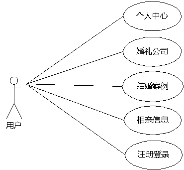 图3.6即为用户用例图,用户权限操作的功能包括预约婚礼公司,收藏婚礼公司,查看结婚案例以及相亲信息,对相亲信息进行留言等。