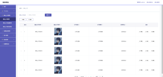 图5.1 即为编码实现的婚礼公司管理界面,婚礼公司信息包括婚礼公司名称,婚礼公司位置,婚礼公司规模,注册资金等信息,管理员修改婚礼公司信息,新增婚礼公司,删除婚礼公司等。