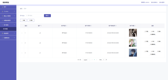 图5.2 即为编码实现的用户管理界面,管理员在用户管理界面中可以为本界面显示的所有用户信息进行查询,修改,删除。
