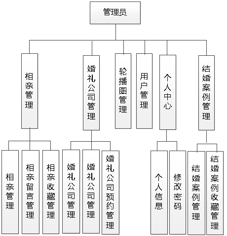 图4.1即为设计的管理员功能结构,管理员权限操作的功能包括管理婚礼公司,管理婚礼公司预约信息,管理结婚案例,管理相亲信息,管理相亲留言,管理用户等。