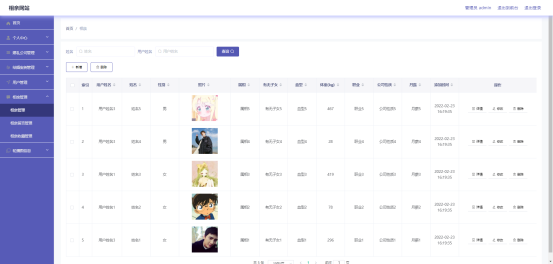 图5.4 即为编码实现的相亲管理界面,相亲信息包括用户姓名,血型,体重,职业,有无子女,属相,照片等信息,管理员可以修改相亲信息,新增相亲信息,查询相亲信息等。