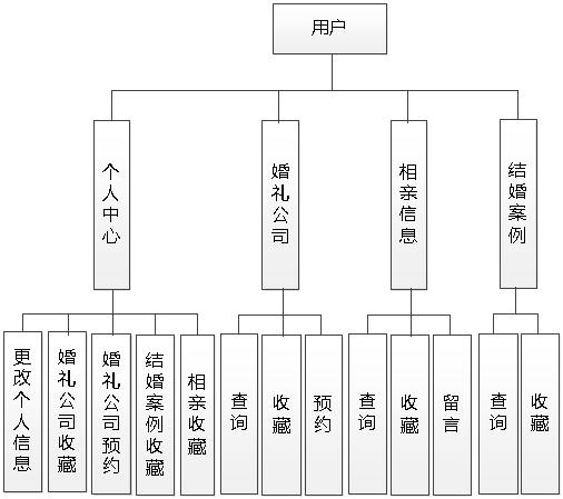 图4.2即为设计的用户功能结构,用户权限操作的功能包括预约婚礼公司,收藏婚礼公司,查看结婚案例以及相亲信息,对相亲信息进行留言等。