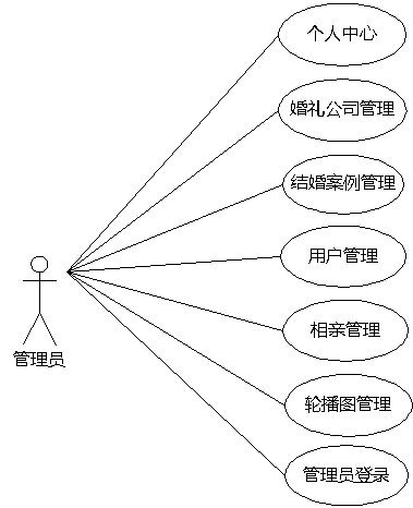 图3.5即为管理员用例图,管理员权限操作的功能包括管理婚礼公司,管理婚礼公司预约信息,管理结婚案例,管理相亲信息,管理相亲留言,管理用户等。