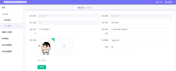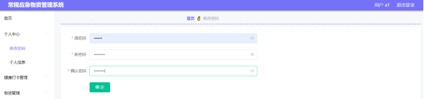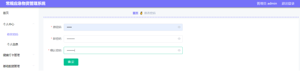 通过设计的个人中心功能模块,管理用户可以选择修改账号密码,查看个人资料信息,通过不定期的对个人账户密码进行更新,保障个人信息安全,修改密码界面设计如图5-1所示,个人信息界面设计如图5-2所示。