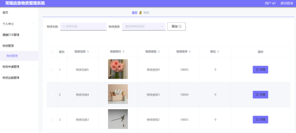 通过设计的物资管理功能模块,管理用户可以查看相关的物资信息记录,可以查到物资名称、物资图片、物资类型、物资库存等详细信息,物资管理界面设计如图5-14所示。
