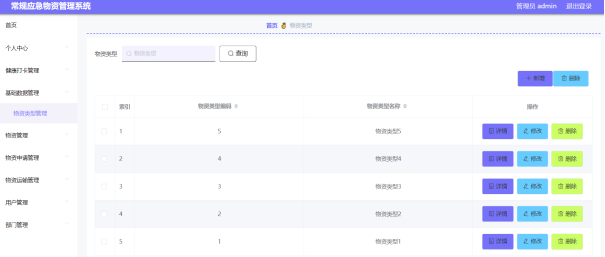 通过设计的基础数据管理功能模块,管理用户可以管理相关的物资类型信息记录,比如进行查看物资类型的详细信息,修改物资类型的名称信息,删除已经失效的物资类型信息记录等操作,物资类型管理界面设计如图5-4所示。