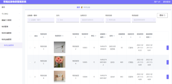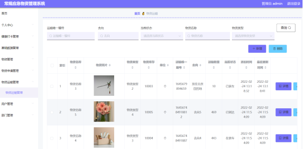 通过设计的物资运输管理功能模块,用户可以查看相关的物资运输信息记录,比如查到物资名称、物资图片、单位、运输数量、当前状态等详细信息,物资运输管理界面设计如图5-16所示。
