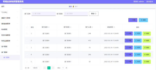 通过设计的部门管理功能模块,管理用户可以管理相关的部门信息记录,比如进行查看部门的详细信息,修改部门的职责信息,删除已经失效的部门信息记录等操作,部门管理界面设计如图5-9所示。
