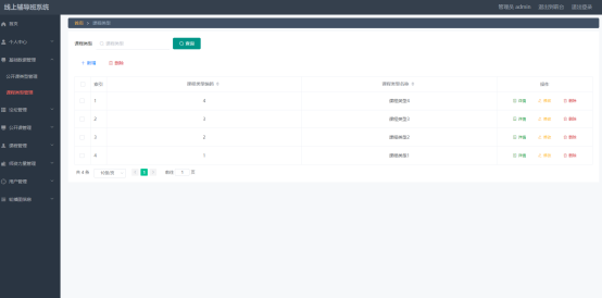 课程类型管理页面显示所有课程类型,在此页面既可以让管理员添加新的课程信息类型,也能对已有的课程类型信息执行编辑更新,失效的课程类型信息也能让管理员快速删除。下图就是课程类型管理页面。