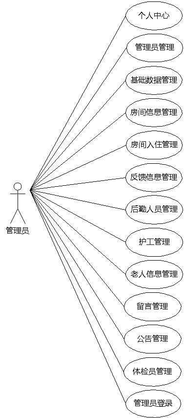 图3.5即为管理员用例图,管理员权限操作的功能包括对后勤人员,体检员,护工,老人,房间信息,房间入住信息,反馈信息以及留言等信息的管理。